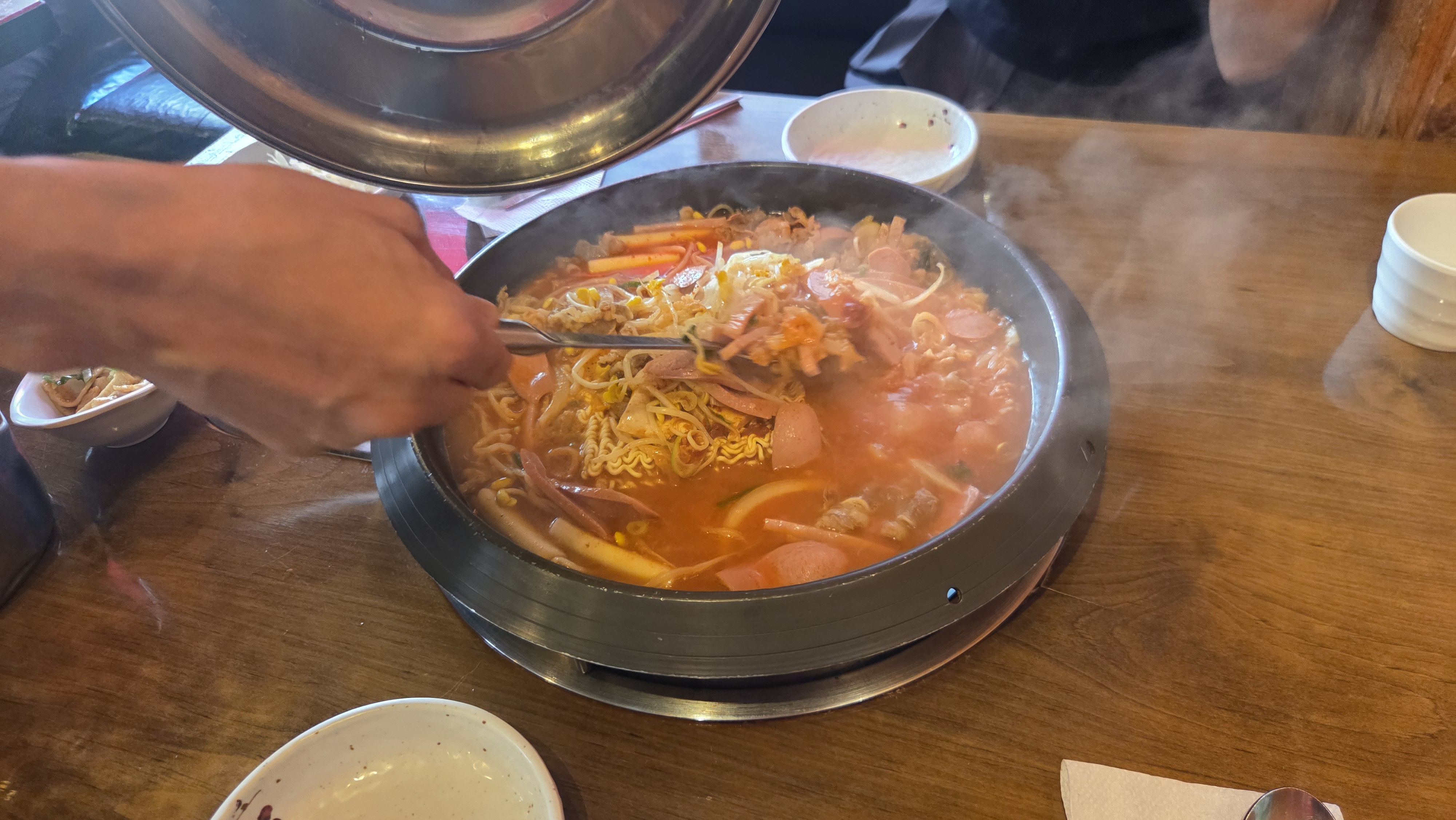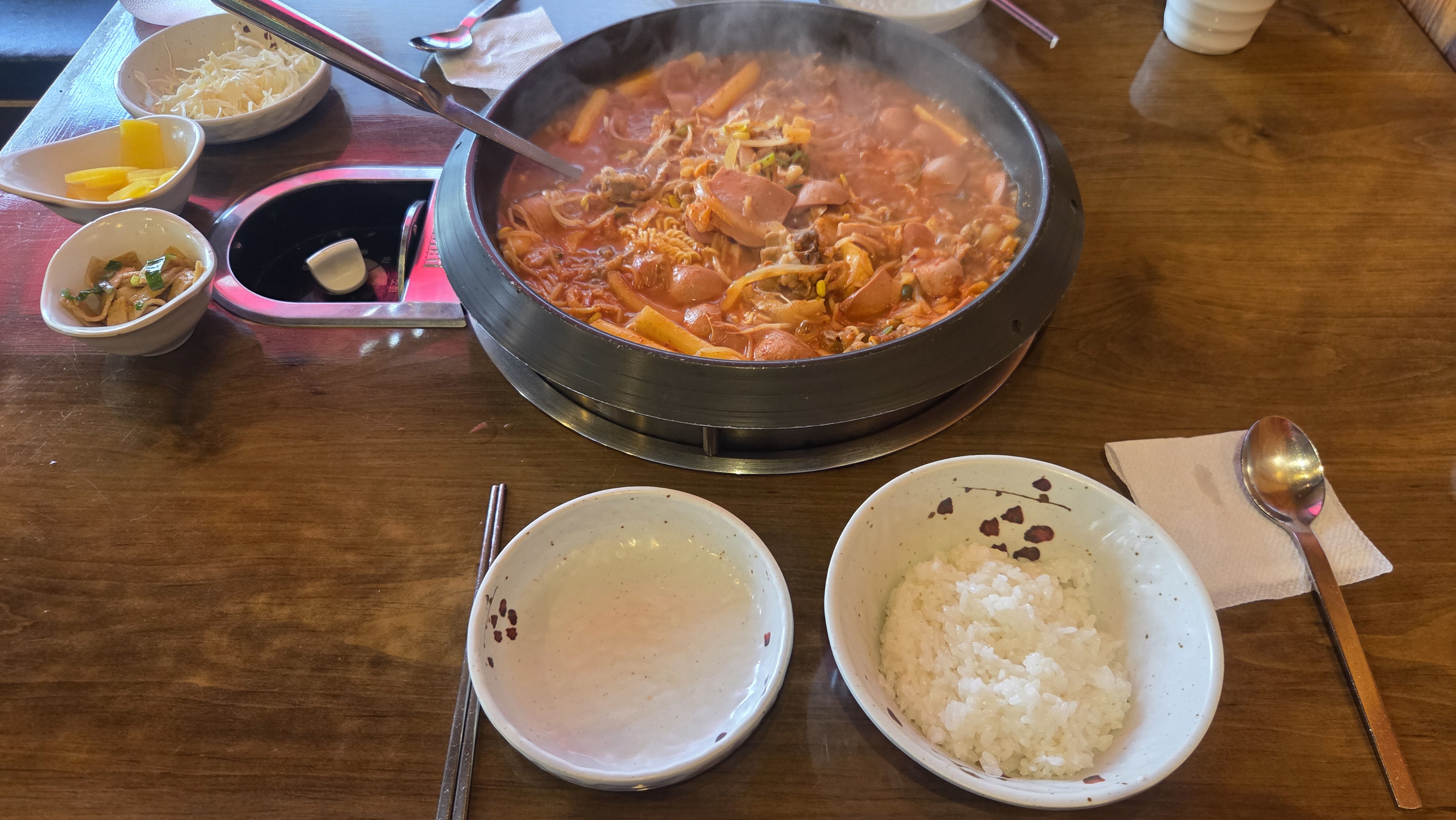 우삽겹 부대찌개 2인 차림 모습 / 사장님이 타이머까지 직접 확인하시고 먹기 최적의 타이밍을 알려주세요!